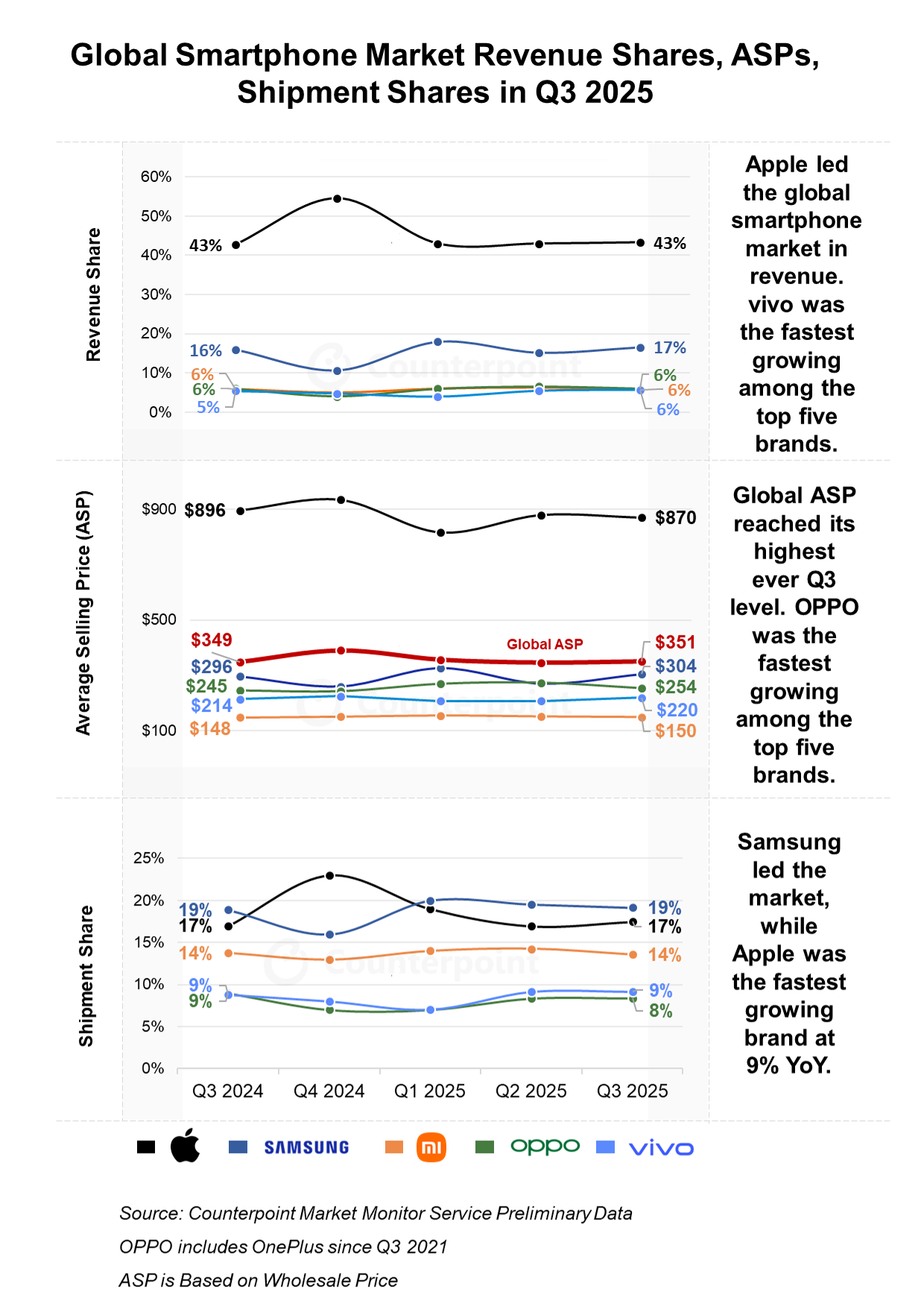Weltweite Smartphone-Umsätze stiegen im dritten Quartal 2025 im Vergleich zum Vorjahr um 5 % 31.10.2025|Daten, Insights|