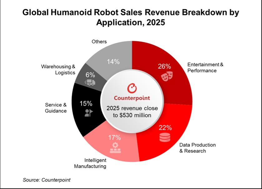 Laut Counterpoint Researchs Humanoid Robots Research entfielen im Jahr 2025 auf diese Bereiche jeweils 26 %, 22 %, 17 %, 15 % und 6 % des weltweiten Umsatzes mit humanoiden Robotern.