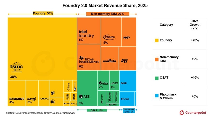 Die traditionelle Definition von „Foundry 1.0“ – die sich ausschließlich auf die Chipfertigung konzentriert – reicht nicht mehr aus, um die aktuellen Marktdynamiken zu beschreiben. Die „Foundry 2.0“-Definition von Counterpoint erweitert den Umfang und umfasst Pure-Play-Foundries, nicht-speicherbasierte Integrated Device Manufacturers (IDMs), OSAT-Unternehmen sowie Photomasken-Anbieter.