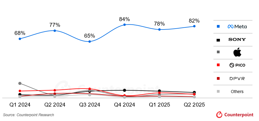 Laut der neuesten Studie des Global XR (AR/VR) Headset Model Shipments Tracker von Counterpoint gingen die weltweiten Auslieferungen von Virtual-Reality-Headsets (VR) im ersten Halbjahr 2025 im Vergleich zum Vorjahr um 14 % zurück. Dies ist auf die anhaltend schwache Verbrauchernachfrage zurückzuführen . Das Wettbewerbsumfeld blieb relativ stabil, mit wenigen neuen Produkteinführungen großer OEMs. Meta behauptete seine klare Führungsposition und hielt im ersten Halbjahr 2025 einen Marktanteil von rund 80 %.